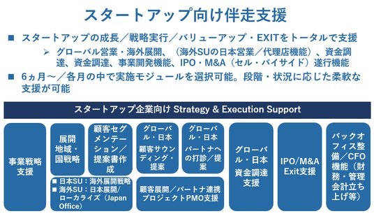 国内外スタートアップ連携や新規事業創出・イノベーションを支援する「グローバルイノベーション伴走」サービスを展開しています。本サービスでは国内・海外でのスタートアップ連携、既存で生まれている新規事業の萌芽やR&D技術テーマの拡販・スケール・社会実装などの新価値・新規事業の創出・強化を月数十万円からスモールスタートを伴走します。(これから新規事業の取り組みをはじめる企業から、既にCVCや二人組合を運用されている企業まで幅広くご支援しています)