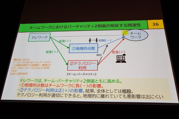 そこで、バーチャル・チームの要素を分解してみてみると、マイナスの影響を与える「地理的分散」と、プラスの影響を与える「テクノロジー利用」の2つに分けられるという。「この2つがチームワークに対して逆向きの影響になっており、全体としては“相殺”される。テクノロジー利用が適切であると、地理的に離れていても悪影響がでにくい」と縄田氏。