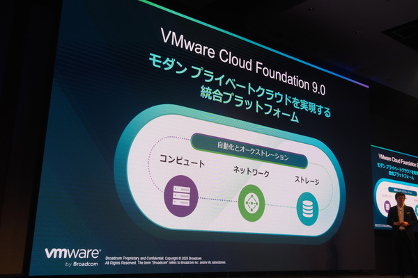 基調講演では、今年6月から提供を開始した“モダンプライベートクラウド”プラットフォームの最新版、「VMware Cloud Foundation 9.0(VCF 9)」の特徴や最新機能について、デモも交えながら紹介した。