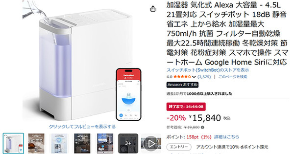 冬の乾燥と電気代の悩みを解決。SwitchBot(スイッチボット)の気化式加湿器(4.5L、21畳対応)が、Amazonタイムセールに登場しました。