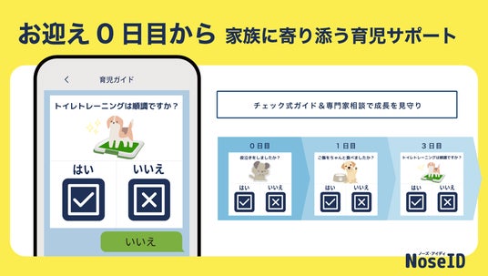 ショップ・ブリーダー向けプランでは、1頭1頭異なるわんちゃんの特性に合わせた育児ガイド・お悩み相談をLINEチャット形式で提供。NoseIDアプリと連携し、お迎え0日目から「母子手帳」のように家族に寄り添う愛犬サポートを提供いたします。