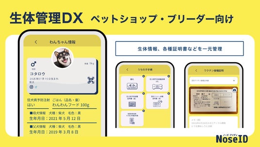 2025年の愛護法改正により、出生記録のデジタル管理ニーズが高まるなか、ペットショップ・ブリーダー向けに生体管理サービスを提供。飼い主はNoseIDアプリを通じて改ざん不可能な愛犬データを受け取り、母子手帳として継続的なお世話サポートを受けることができます。