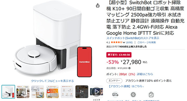 SwitchBot(スイッチボット)のロボット掃除機「K10+(自動ゴミ収集モデル)」が、Amazonタイムセールに登場しました。