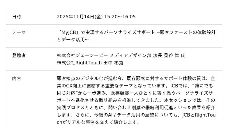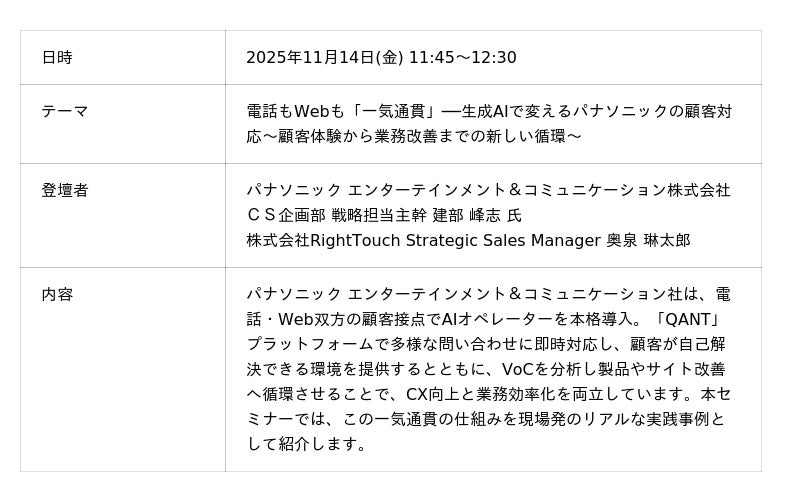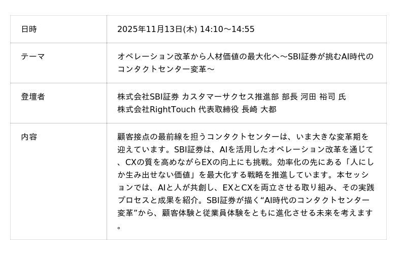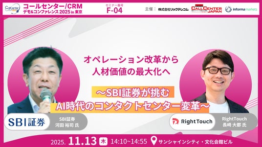 データとAIでカスタマーサポートを変革する株式会社RightTouch(本社:東京都港区、代表取締役:野村修平/長崎大都)は、2025年11月13日(木)~11月14日(金)にサンシャインシティ文化会館ビルで開催される「コールセンター/CRM デモ&コンファレンス 2025 in 東京」にブースを出展します。