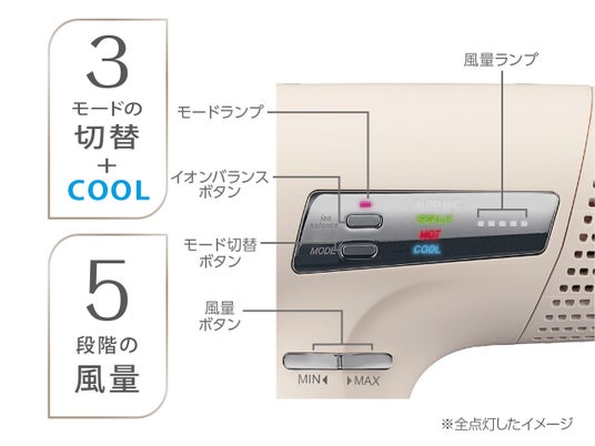 ・5段階風量調節、3つのモード切替(HOT/SCALP/AUTO HOT&COOL)+COOLモード搭載。