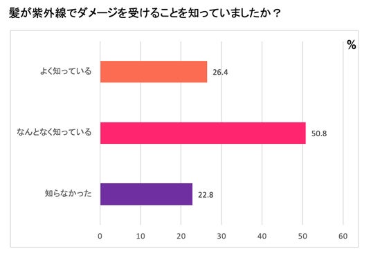 髪への紫外線ダメージは77.2%がある程度の認知を得ている一方、髪のアフターケアの行動には結びつかず。