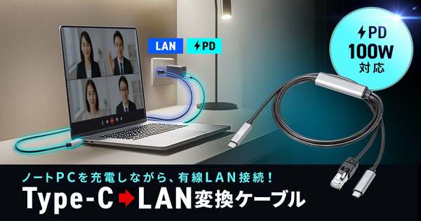 サンワサプライ、PD100W急速充電対応のUSB Type-C to LAN変換ケーブルを発売