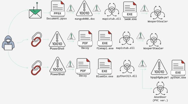 分析の結果、Confuciusグループは継続的に手法を進化させており、初期の攻撃ベクトルとしてさまざまなファイルタイプを採用して検知を回避し、OLEオブジェクト、悪意あるスクリプト、リンクファイル、PowerShellローダー、MSILダウンローダー、高度に難読化されたペイロードを連鎖的に利用していることが明らかになりました。このキャンペーンは同グループの技術的な俊敏さを浮き彫りにしており、WooperStealer、MSILベースのAnonDoor、およびPythonベースの亜種など、マルウェアファミリーを切り替えています。