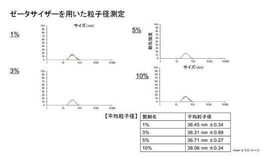 粒子径の測定では、平均約38nmという極めて微細な構造を有しており(図参照)、このナノ構造が肌表面に広がりやすく密着することで、成分の広がりやすさと留まりやすさが向上します。