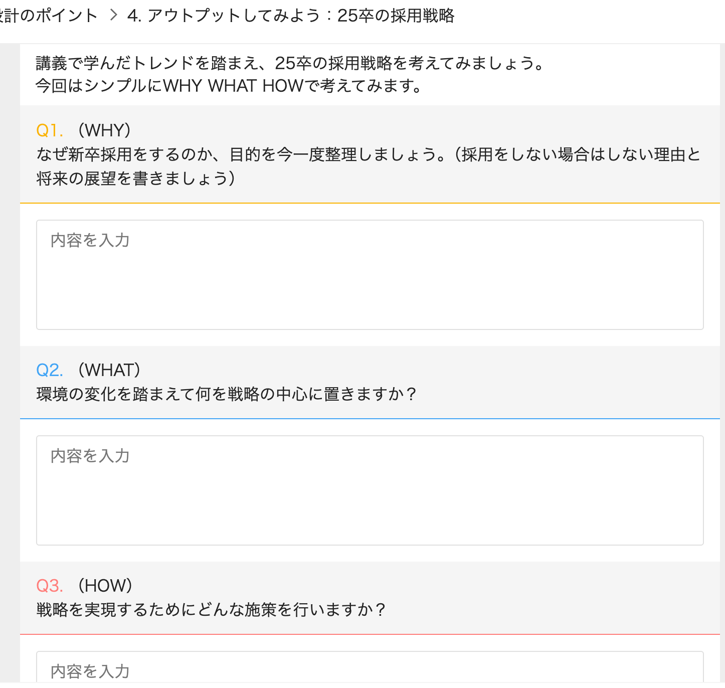 上記画像のように、講義で学んだトレンドやフレームワークを踏まえ、「なぜ新卒採用を行うのか(WHY)」「戦略の中心に何を置くか(WHAT)」「どんな施策を行うか(HOW)」といった問いに対し、自身の言葉で戦略を言語化し、提出するタスクが設けられています。