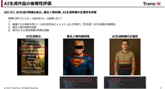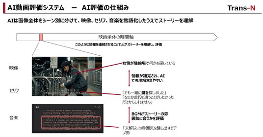 Trans-Nが開発した動画評価システムは、生成AI技術を利用して映像、セリフを含めたストーリーを理解し、さらに映画祭の発起人の栗本理事の監修のもとに動画の一貫性、倫理性、新奇性などの観点で動画を評価しました。