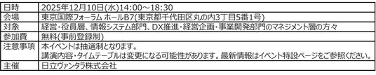 株式会社日立製作所(以下、日立)のグループ会社である日立ヴァンタラ株式会社(以下、日立ヴァンタラ)は、12月10日(水)に「Hitachi Vantara Exchange Japan 2025 ― AI時代のデータ変革 事業価値を最大化し未来を拓く1日」を日本で初開催します。本カンファレンスは、AIやデータ、ハイブリッドクラウドの専門家やビジョナリーリーダーが登壇し、イノベーションを支えるデータ基盤の最新の知見や国内外の事例を、基調講演やパネルディスカッションを通じて分かりやすくご紹介します。また、参加者様同士が直接交流できるネットワーキングの場もご用意しています。企業の経営層、IT、DX推進部門、経営企画部門の方など、データ活用による事業成長に関心をお持ちの皆様を対象としています。