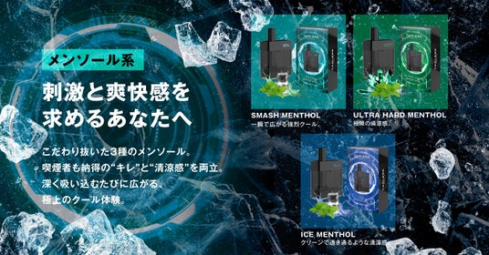 旧モデルでも人気で、リピーターの多かったメンソール系は、幅広い喫煙者の好みに合うように、こだわりぬいた3種(スマッシュメンソール・ウルトラハードメンソール・アイスメンソール)から選べます。