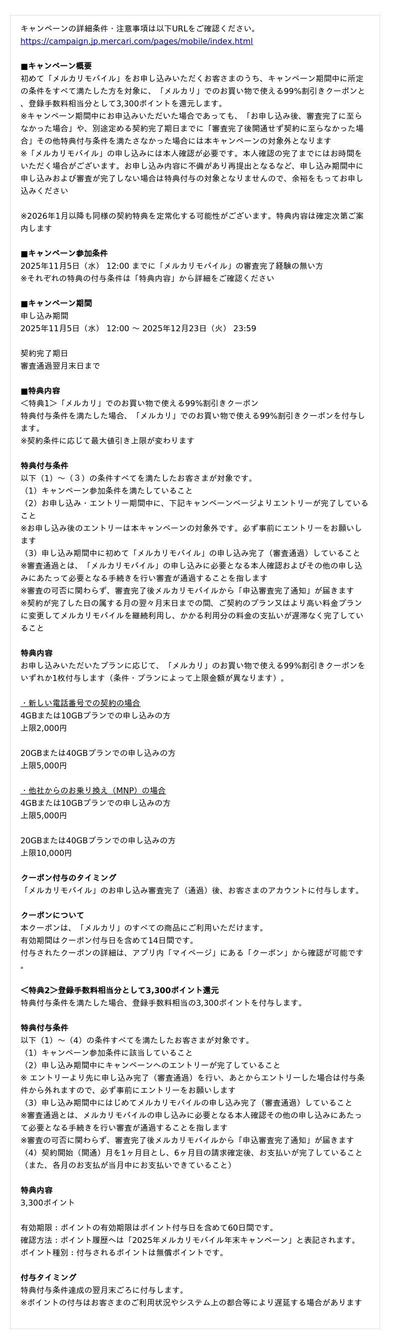 株式会社メルカリ(以下、メルカリ)は、2025年11月5日より、モバイルサービス「メルカリモバイル」を初めて申し込みいただいたお客さまを対象にキャンペーンを実施いたします。