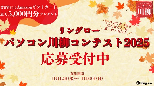 IT機器のリユース事業を展開するリングロー株式会社(本社:東京都豊島区、代表取締役:碇敏之)は、11月12日(水)から11月30日(日)まで、芸術の秋にちなんで「パソコン川柳コンテスト」を開催します。パソコンにまつわるエピソードやPCを使っていて起きる日常の“こんな体験”を、五・七・五で表現した作品を全国から募集します。本企画は今年で第二回目の開催となります。