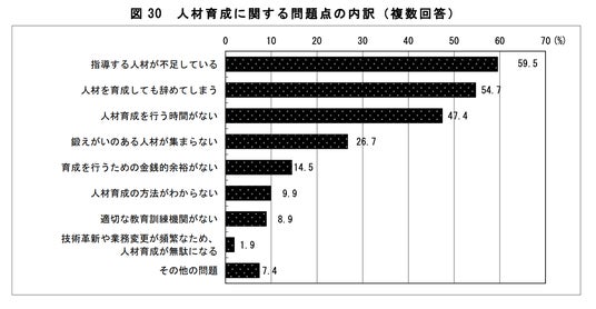 - 育成は“仕組み”不足:法人事業所の79.9%が人材育成に「何らかの問題」ありと回答。内訳は「指導する人材が不足(59.5%)」が最も高く、続いて「育成しても辞める(54.7%)」「育成の時間がない(47.4%)」が上位にあがっています。