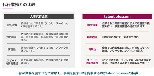本サービスが目指すのは“永続的な外注”ではなく内製化の完了です。実務を並走しながらノウハウ・マニュアル・運用の核を移転し、契約終了後も成果が出続ける状態を残します。そのために、採用・育成・評価・労務を個別最適にとどめず、最短3カ月で“つながった人事”を社内に定着させ、事業の実行速度を上げる--それがtalent blossomです。