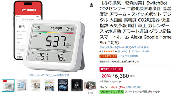 冬の乾燥やウイルス対策で「換気」のタイミングに悩む方へ。SwitchBot(スイッチボット)のCO2センサー(二酸化炭素濃度計+温湿度計)が、Amazonタイムセールに登場しました。