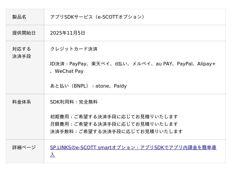 SP.LINKS株式会社(本社:東京都港区、代表取締役社長:野村亮輔)は、決済サービス「e-SCOTT」のオプションとして提供する「アプリSDKサービス」をアップデートし、以下の決済手段を新たに統合しました。