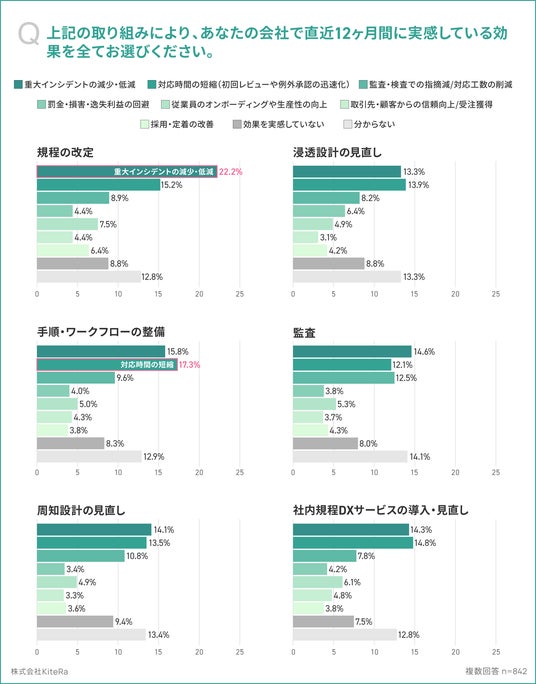 また、効果実感において「上記の取り組みにより、あなたの会社で直近12ヶ月間に実感している効果を全てお選びください。(複数回答)」と質問したところ、”重大インシデントの減少・低減”効果の最多は「規程の改定」が22.2%、次いで「手順・ワークフローの整備」が15.8%、「監査」が14.6%となりました。