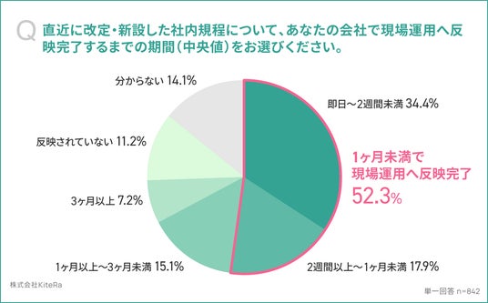- 規程改定の現場運用への反映「1ヶ月未満」52.3%。一方で「反映されていない」11.2%、「分からない」14.1%も