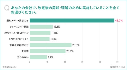 「あなたの会社で、改定後の周知・理解のために実施していることを全てお選びください。(複数回答)」の質問に対し、最多は「通知メール・掲示のみ」が48.2%、次いで「管理者向け説明会」が23.8%、「未実施」が20.4%、「eラーニング・動画」が13.1%、「理解テスト・確認ボタン」が11.8%でした。周知施策は「通知メール・掲示」が中心で、eラーニングや理解テストといった理解促進施策の実施割合は低いことが分かりました。