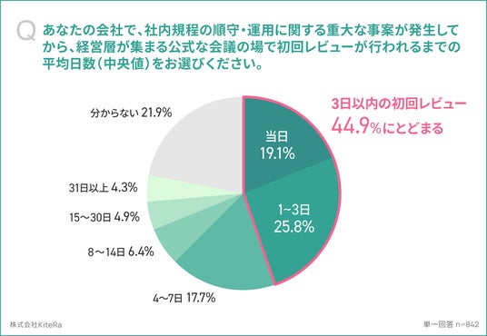 「あなたの会社で、社内規程の順守・運用に関する重大な事案(規程違反、法令違反、情報セキュリティ・個人情報、労務トラブルなど)が発生してから、経営層が集まる公式な会議の場(取締役会・経営会議など)で初回レビュー(状況報告・対応方針の確認)が行われるまでの平均日数(中央値)をお選びください。(単一回答)」の質問に対し、最多は「1~3日」が25.8%、次いで「当日」が19.1%、「4~7日」が17.7%でした。