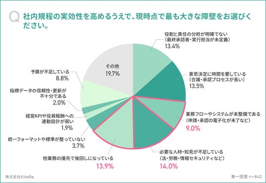 「社内規程の実効性を高めるうえで、現時点で最も大きな障壁をお選びください。(単一回答)」の質問に対し、回答数が多い順に「必要な人材・知見が不足している(法・労務・情報セキュリティなど)」が14.0%、「他業務の優先で後回しになっている」が13.9%、「意思決定に時間を要している(合議・承認プロセスが長い)」が13.5%、「役割と責任の分担が明確でない(最終承認者・実行担当が未定義)」が13.4%、「業務フローやシステムが未整備である(申請・承認の電子化が未了など)」が9.0%でした。