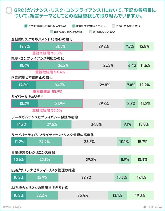 「安心して働ける世界をつくる」をミッションに掲げ、社内規程DXサービス「KiteRa Biz(キテラビズ)」と社労士向けサービス「KiteRa Pro(キテラプロ)」を提供する株式会社KiteRa(代表取締役 執行役員 CEO:植松隆史、本社:東京都港区、読み:キテラ、以下「当社」)は、20~70歳の経営層(代表取締役/取締役/監査役/執行役・執行役員)842名を対象に「企業のGRC(ガバナンス・リスク・コンプライアンス)に関する実態調査 vol.3」を実施しました。