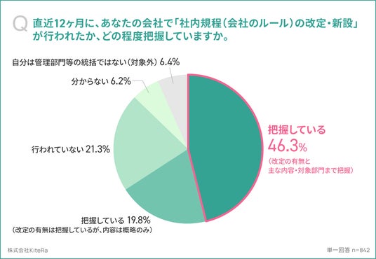 「直近12ヶ月に、あなたの会社で社内規程(会社のルール)の改定・新設が行われたか、どの程度把握していますか。(単一回答)」の質問に対し、最も多かったのは「把握している(改定の有無と主な内容・対象部門まで把握)」が46.3%、次いで「行われていない」が21.3%、「把握している(改定の有無は把握しているが、内容は概略のみ)」が19.8%と回答しました。