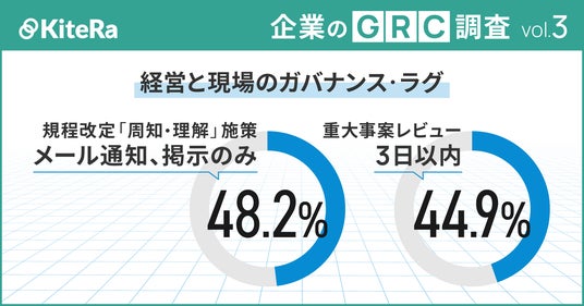 【企業のGRC調査】経営と現場のガバナンス・ラグ~規程改定”周知・理解”施策は「メール通知、掲示のみ」48.2%。重大事案レビューは「3日以内」44.9%~