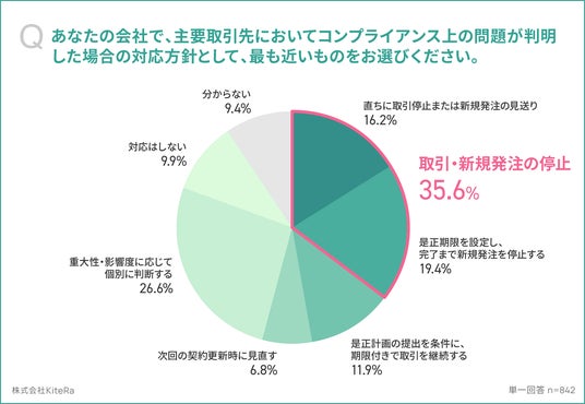 サプライヤー対応では、「取引・新規発注の停止(是正期限を設定し、完了まで新規発注を停止する/直ちに取引停止または新規発注の見送り)」は約3社に1社(35.6%)に達しました。