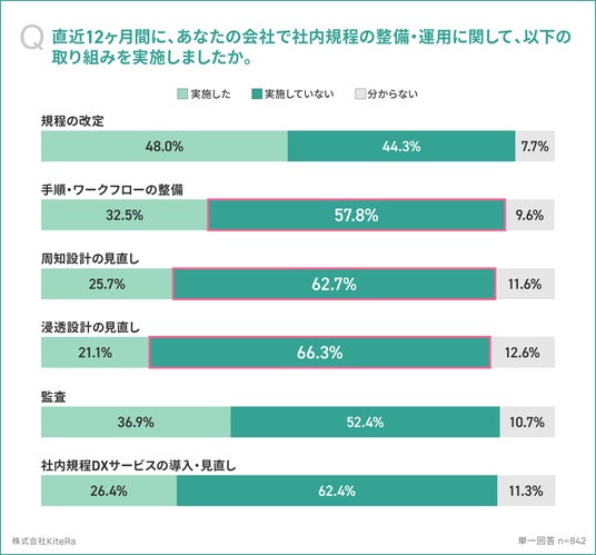 「直近12ヶ月間に、あなたの会社の社内規程の整備・運用に関して、以下の取り組みを実施しましたか。(単一回答)」の質問に対し、実施状況において”実施した”の最多は「規程の改定」が48.0%でした。一方、”実施していない”は回答数が多い順に「浸透設計の見直し」で66.3%、「周知設計の見直し」が62.7%、「社内規程DXサービスの導入・見直し」が62.4%、「手順・ワークフローの整備」が57.8%となりました。