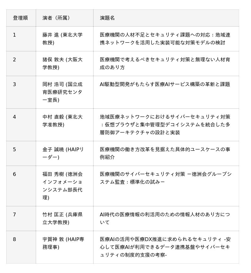 2025年11月12日から開催される第45回医療情報学連合大会(兵庫県姫路市アクリエひめじ)にて、2025年11月15日AMに医療AIプラットフォーム技術研究組合(略称「HAIP」)がオーガナイザーを務める公募企画オーガナイズドセッション『医療AIとクラウド活用の進展に伴うサイバーセキュリティ対応の最前線 ‐ゼロトラスト型防御やサイバーレジリエンスに向けた実践報告‐』を行います。生成AIに代表されるAIサービスやクラウドサービスの利活用に必要なサイバーセキュリティに関する取組みを幅広い観点から8名の演者がお話しします。
