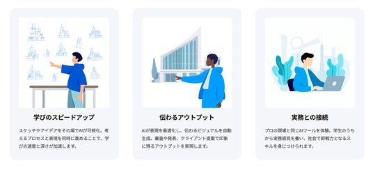 また、実際の設計・プレゼンテーション現場で利用される機能を通じて、学生が自らのアイデアを反復的に “スタディ” しながら深める力を養い、実務感覚とAIリテラシーを兼ね備えた次世代の建築人材として成長できるよう支援します。
