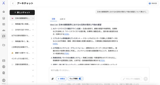 “プロンプト最適化”機能により、曖昧な質問でも目的に沿った明確な問いへと導きます。さらにWeb検索機能を併用すれば、出典付きの回答で論文・調査・設計研究の信頼性を高めることができます。