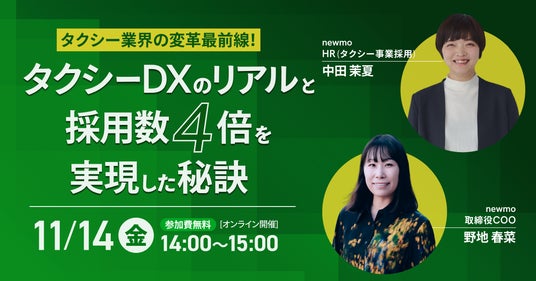 newmo株式会社(本社:東京都港区、代表取締役CEO:青柳直樹)は、タクシー会社向け無料オンラインセミナー「タクシー業界の変革最前線 ― タクシーDXのリアルと採用数4倍を実現した秘訣」を2025年11月14日(金)に開催いたします。