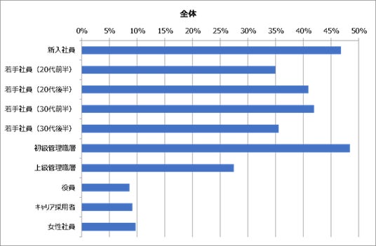 多くの組織では新入社員から初級管理職層までを重視していますが、中でも初級管理者層と新入社員、そして30歳前後の若手社員を重要視しているという傾向でした。人手不足が深刻化する現代の組織運営において、キャリアの節目となる年代の社員に対して、定着と、もう一段二段のレベルアップといった期待がうかがえます。
