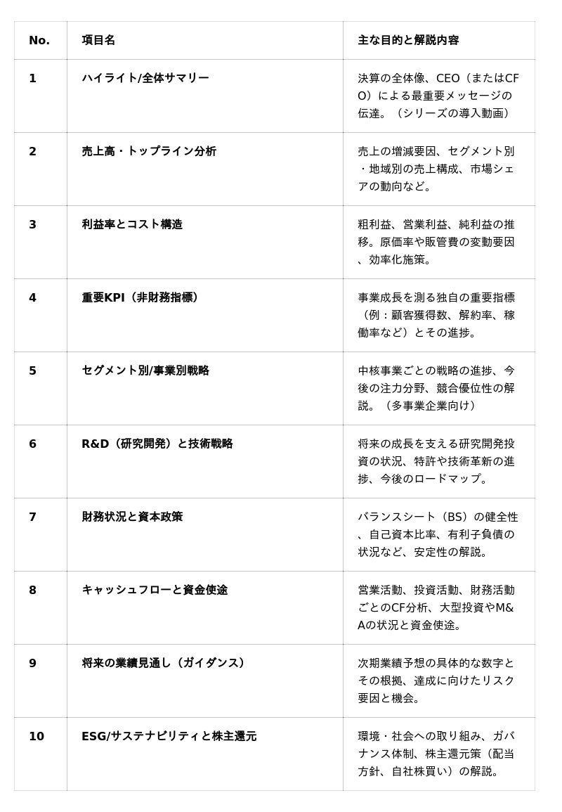 「ショート動画屋さん」では、複雑な企業のIR情報にも対応するため、以下の10項目を核とした動画シリーズの制作を推奨しています。これにより、企業価値を構成する要素を網羅し、投資家の多岐にわたる関心に対応します。