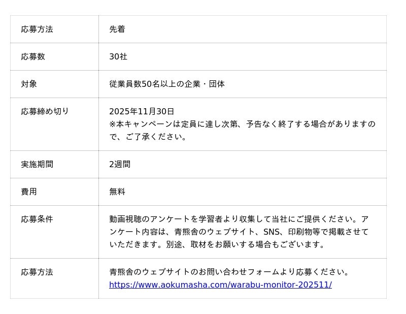 株式会社青熊舎(所在地:東京都港区、代表取締役:太田真人、以下「青熊舎」)は、急増するランサムウェア被害への対策として、従業員の行動変容を促す研修動画『WARABU 二重脅迫型ランサムウェア編』の30社限定無料モニター企業を募集します。