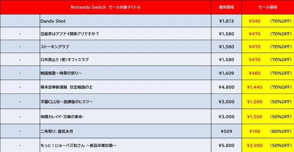 このほかにも高評価乙女ゲーム『DesperaDrops/デスペラドロップス』や、コミカルでかわいい棒人間たちのミニゲーム集『あのゲー』シリーズなどがラインアップ。以下では、セールタイトルをピックアップして紹介。ほかにも人気タイトルが多数ラインアップしているので、詳細は下記のリンクより確認してほしい。