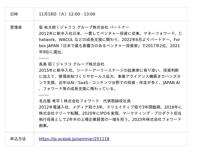 本資金調達の引受先であるジャフコ グループ株式会社パートナーの坂さま、および長島さまより「なぜAI採用市場に投資したのか」をお話しいただき、フォワード代表・名古屋と、現場の視点も踏まえた、AI採用市場で成長する構造と日本のマーケットにおけるAI × SaaSの可能性を議論いたします。