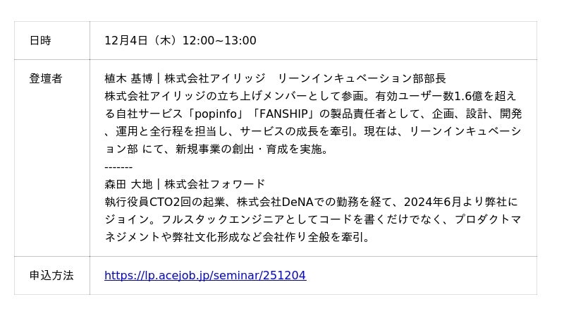 「AIはエンジニア採用をどう変えるのか?」をテーマに、「エースジョブ」導入企業のアイリッジ様とエンジニア採用の最前線を現場目線から紐解きます。多様化するスキル、アサインの複雑化、そして可視化がもたらす、新しい採用の形を明らかにするセミナーです。