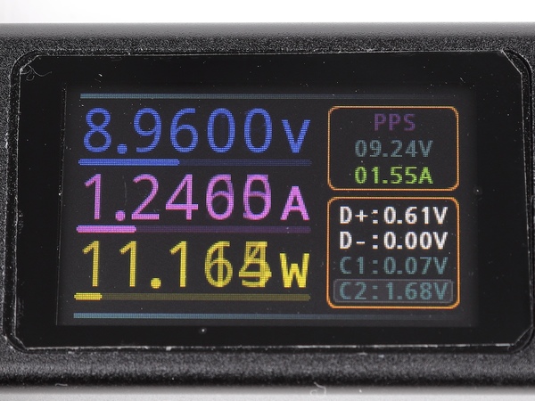 見たい情報に合わせて画面を切り替えればいいだけなので、難しいことはありません。個人的によく使うのは、充電モードがわかる1つ目の画面。機器間で調整した電圧と電流の値(PDOなど)と、実際の値とが1画面で確認できるのが気に入っています。
