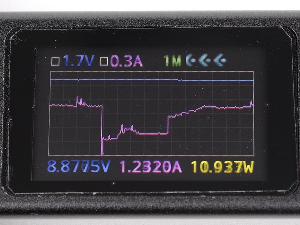 使い方は簡単で、USB PD対応の充電器とデバイスの間に挟むだけ。これで、電圧と電流、充電時のモードなどが確認できます。メインとなる電力計機能は3つあり、◀▶ボタンで画面を切り替えられます。